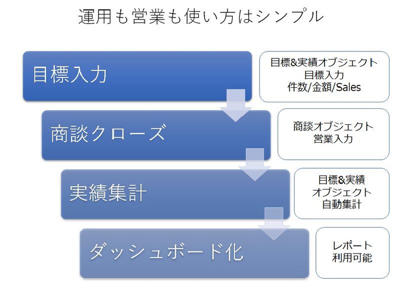 SalesforceのThe Model「集客から商談・クローズ、カスタマーサクセスに至るまでの各段階で情報を可視化・数値化し、部門を越えた連携を軸に売上の増大を図っていく考え方」に基づき、商談・クローズ段階の初期値である「営業目標と商談実績」にクローズアップ。素早く把握することができ、多くの営業部が望んでいた機能です。