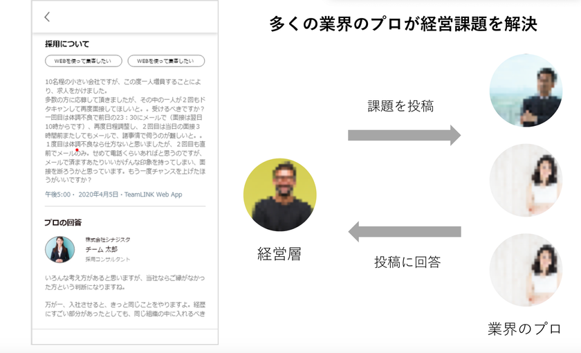 『Team Link』は集客、人材採用という社長の課題を業界のプロに直接相談して解決するサービスです。