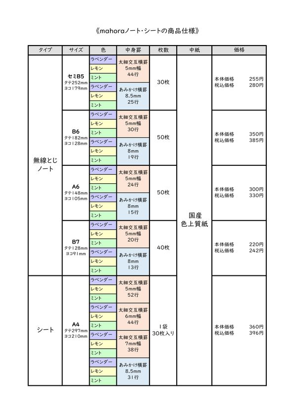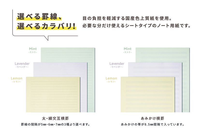 購入者からは、「文字を書くことに困難がある子どもが『全然違う』と嬉しそうに使っている」「読みにくい自信に欠ける字が、大きめの読みやすい字になった」などの声(参考資料参照)と同時に、新たに複数の要望も届きました。緑色にこだわりのある方が多いこと、就職活動時や職場では、メモを取る方が多く、携帯に便利な小さめサイズが求められていること、支援学級では使用方法の自由度がより高いシートタイプが好まれることを知り、レギュラー商品のセミB5サイズノート「レモン」「ラベンダー」に加えて、新色の「ミント」、「小さいサイズのノート」「A4サイズのシート」を新たに製品化することを決めました。