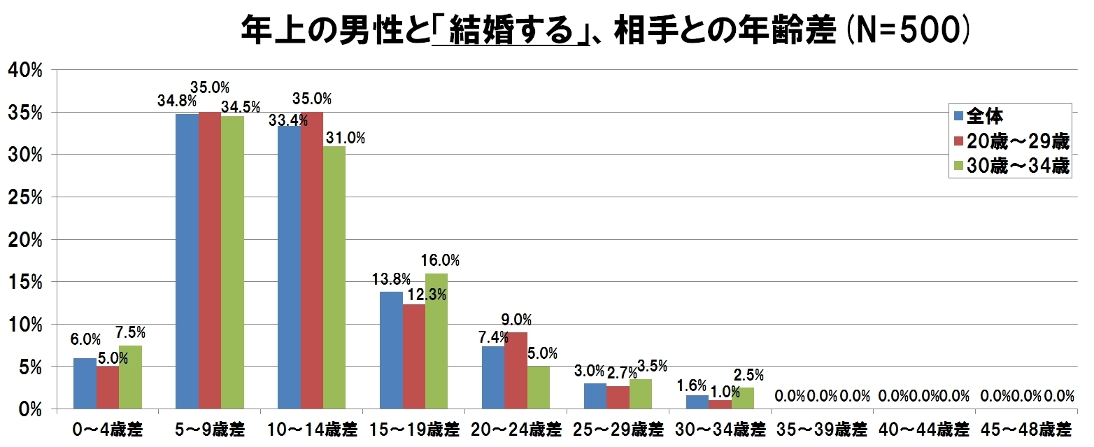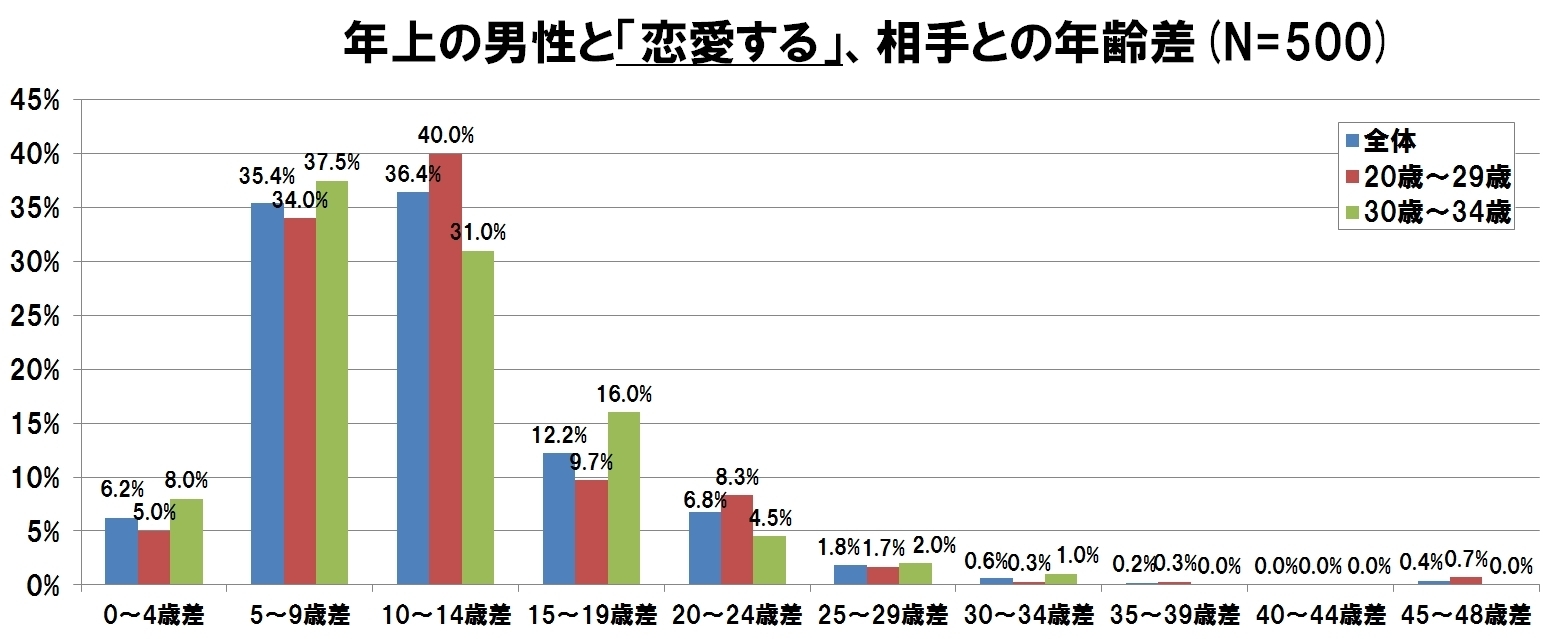 まず、年上の男性と“恋愛”または“結婚”する際、対象になる「年齢差」について尋ねたところ、全体(20歳〜34歳)のうち、「10歳以上は“恋愛”対象になる」と答えた割合が58.4%、「“結婚”対象」でも「10歳以上はOK」の割合が59.2%となりました。