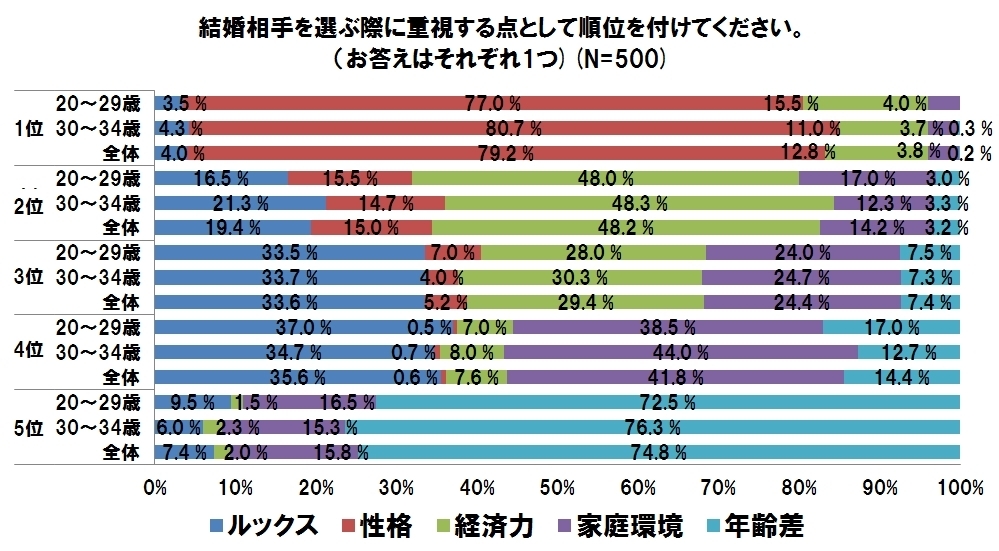 次に、結婚相手を選ぶ際に重視する点を「経済力」「ルックス」「年齢差」「性格」「家庭環境」の5項目に分け、その順位について尋ねました。