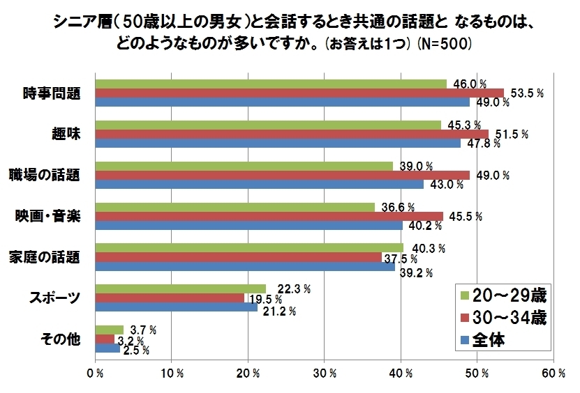 年上と会話するときに、共通の話題になるものは?という設問(複数回答)では、「時事問題」と答えた方は245人(49%)で最も多く、多かったのは、「趣味(47.8%)」「映画・音楽(40.2%)」といった内容。