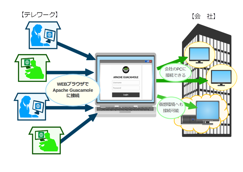 『Apache Guacamole(アパッチ ワカモレ)』とは、ウェブブラウザを用いて遠隔にあるコンピュータへ接続できる無償のソフトウェアです。通常のリモートデスクトップの機能に加え、アクセス制限ができるなどセキュリティを強化する機能もあり、テレワークでも活用できるソフトウェアです。