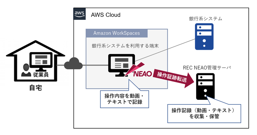 この課題に対しソニー銀行では、既に勘定系システムに当社証跡取得ソリューション「ESS REC」を導入していた実績やAWS上で稼働可能な点などをもとに評価を行い、在宅環境下の操作内容の把握・管理に特化している、当社関連製品「ESS REC NEAO」の採用を決定し、2021年2月、運用を開始しました。