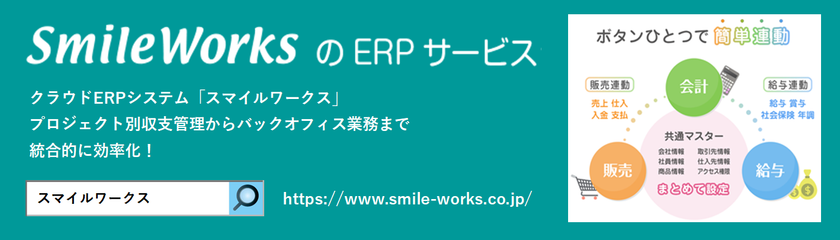 クラウドERP「SmileWorks」( https://www.smile-works.co.jp/ )は、販売・仕入・在庫管理、給与・賞与計算・年末調整・マイナンバー管理、経費精算や財務会計など、企業のバックオフィスを全て統合して、自動会計仕訳や資金繰り表の自動作成を実現するクラウドサービスです。従来のパッケージソフトを組み合わせて業務を行うよりも、3倍〜10倍の生産性を実現しています。