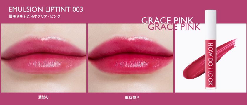日本人女性の肌色になじみ、上品な口元に装う「003グレイスピンク」は、絶妙な透明感で、ナチュラル感を残しつつ、旬顔にチェンジ。美的にもガーリーにも応用が利く万能タイプです。
