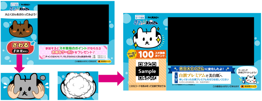 今回は「さわって大とくさん」という簡単なゲームで展開。テレビリモコンを使用してデータ放送内の「さわる」ボタンを押すと、画面内の大とくさんが次第に変化。「さわる」回数がある一定数を超えると、大とくさんが商品の魅力に応じた形に変化します。