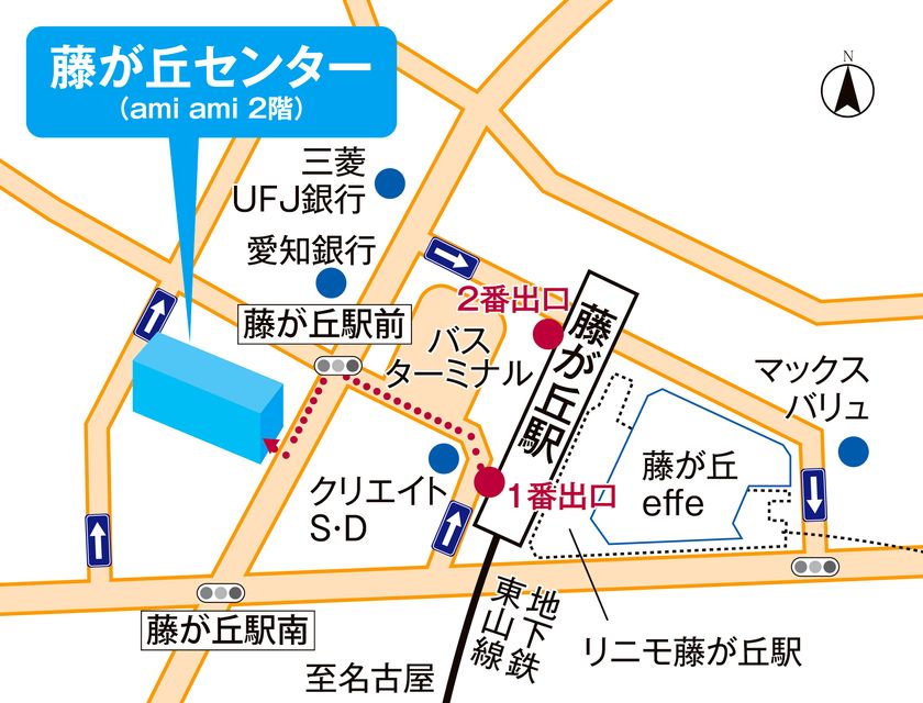 地下鉄東山線・リニモ「藤が丘」駅から徒歩2分、近隣住民からの認知度が高い商業ビルの2階に出店いたします。