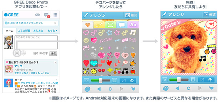 ・ユーザーはAndroid(TM)/iOS対応端末で撮影した写真を手軽にデコレーションでき、すぐに「GREE」に投稿して、友だちとシェアできるようになります。