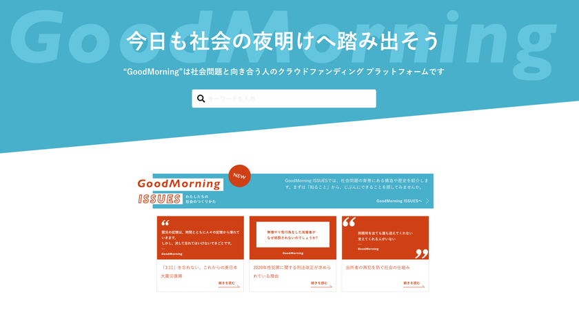 ソーシャルグッドに特化した、社会問題と向き合う人のクラウドファンディングプラットフォームです。CAMPFIRE内でサービスを開始し、2019年4月「誰の痛みも無視されない社会に」をビジョンに掲げ、株式会社CAMPFIREより分社化いたしました。「誰もが社会変革の担い手になれる舞台をつくる」をミッションに、社会問題と向き合う人のクラウドファンディングをサポートしています。