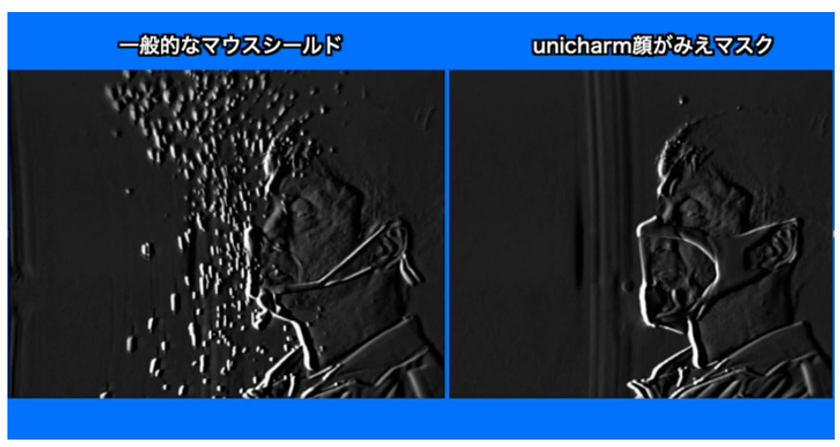 <一般的なマウスシールドと『unicharm 顔がみえマスク』によるくしゃみ時の飛沫の飛散比較>