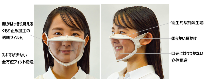 このような問題を解決するために、口元が見えやすいマスクをご自身で手作りして相手の方へ配布したり、マウスシールド等を付けてもらったりと、苦労していることが判りました。しかしながら、手作りしたマスクや、口を動かしやすいよう設計された隙間の多いマウスシールドは、本来マスクの機能に求められる飛沫の抑制に不安を残していました。