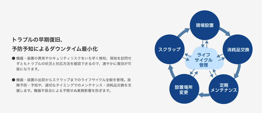 ・ 機器・装置の現場設置からスクラップまでのライフサイクル全般を管理。故障予防・予知や、適切なタイミングでのメンテナンス・消耗品交換を支援します。機器不具合による予期せぬ業務影響を防ぎます。