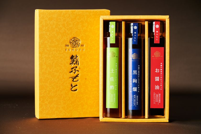 ぽんず2種、お醤油、土佐酢のなかからお好きな3点をオリジナル化粧箱に詰めてお届けします。