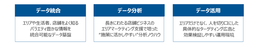 既存の広告メニューだけでなく、競合も加味した高精度な店舗分析や顧客理解、最適な配信エリア設定、さらに効果測定までを一気通貫で支援し、店舗のマーケティング施策の全体最適を支援します。