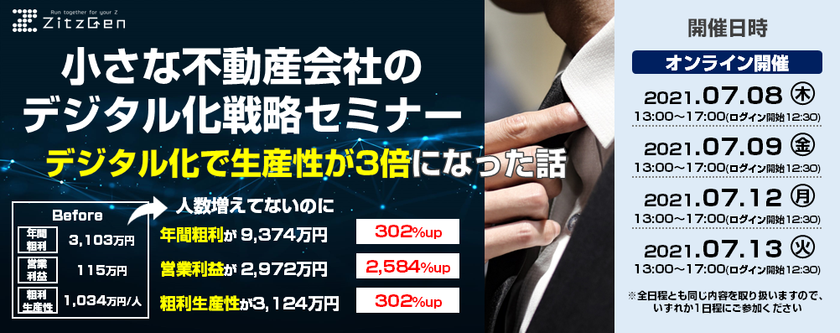 株式会社ZitzGen(所在地:東京都中央区、代表取締役 社長執行役員:吉本 大起、※読みがな:ジツゲン)は不動産売買事業者を対象に、デジタル活用で生産性が上がり、儲かるようになった不動産会社の具体的な取り組みを解説する『小さな不動産会社のデジタル化戦略セミナー』を、2021年7月8日(木)、9日(金)、12日(月)、13日(火)にオンラインにて開催いたします。