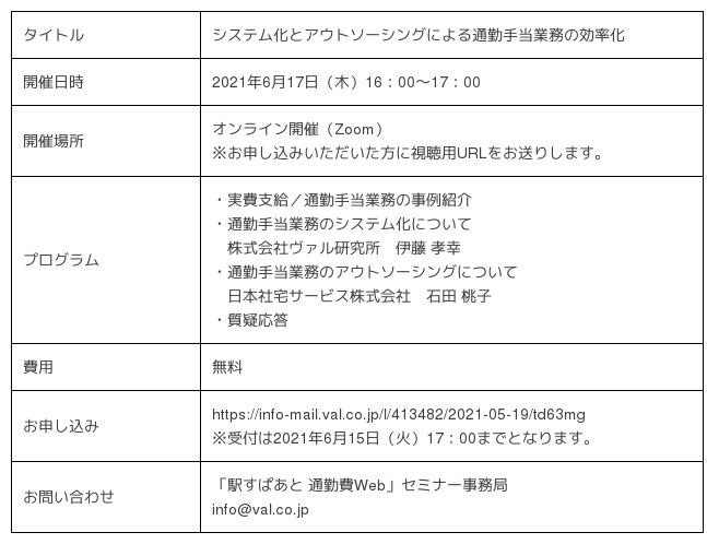 経路検索サービス「駅すぱあと」を提供する株式会社ヴァル研究所(本社:東京都杉並区、代表取締役:菊池 宗史)は2021年6月17日(木)、在宅勤務と出社勤務の併用にともなう通勤手当の混乱や管理の煩雑化などに課題を持つ人事・総務向けに、通勤手当業務のシステム化とアウトソーシングの活用法を紹介するWebセミナーを、日本社宅サービス株式会社と共同で開催します。