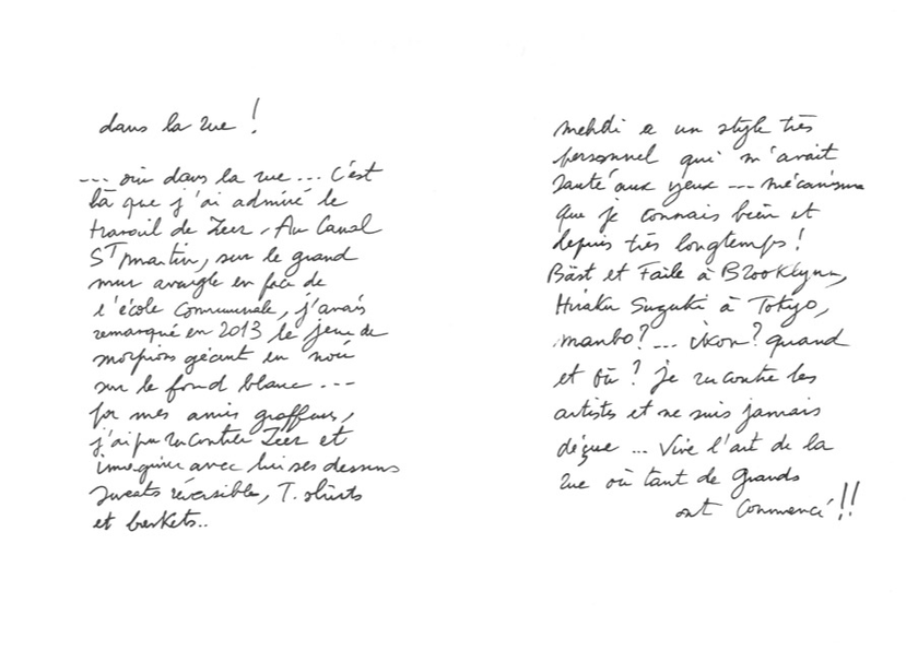 ・・・そう、通りを歩いているとき。サン・マルタン運河近くで、小学校の正面にある、窓のない大きな壁に描かれた彼の作品が目に留まりました。2013年のこと。白い壁に黒で描かれた巨大な○×ゲームに気がついたのです・・・。グラフィティアーティストの友人を介して、ゼールに会い、一緒に彼の作品を使ってリバーシブルのスウェットや、Tシャツ、スニーカーを作りました。