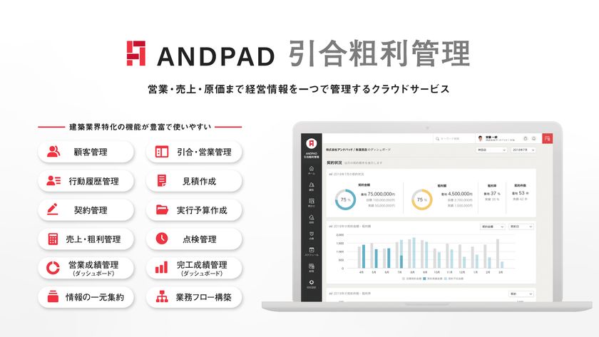 「ANDPAD引合粗利管理」は、営業進捗から売上・原価まで、経営を支える情報をひとつに集約し、管理を行うことができる業務支援サービスです。