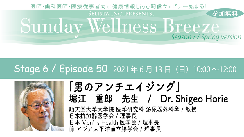 セリスタ株式会社(東京都千代田区、代表取締役:伊藤 承正)は、2021年6月13日(日)に医師・歯科医師・薬剤師・医療従事者向け無料Webセミナー「Sunday Wellness Breeze Season 7」のStage 6として、泌尿器外科分野・抗加齢医学分野でとても有名な堀江 重郎先生(順天堂大学大学院 医学研究科 泌尿器外科学/教授、日本抗加齢医学会/理事長)によるZOOM講演「男のアンチエイジング」を開催します。
