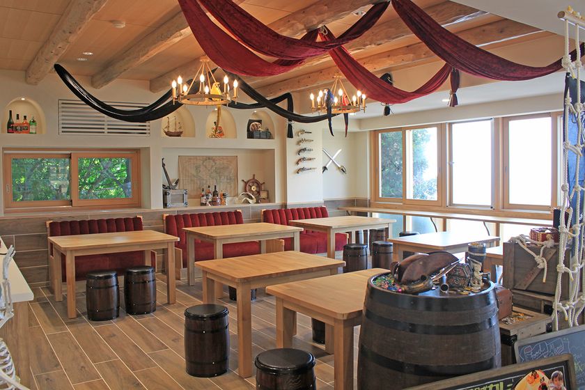 2階カフェ「海賊の隠れ家」の店内は楽しい装飾品がいっぱい♪