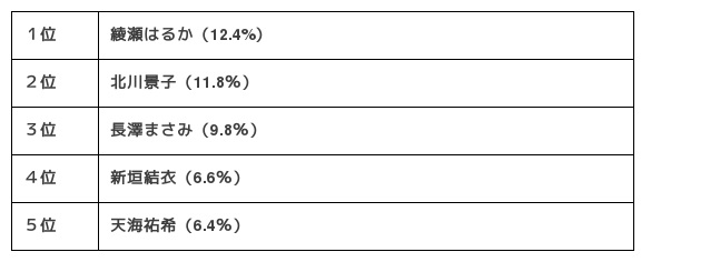 1位:綾瀬はるか 2位:北川景子 3位:長澤まさみ