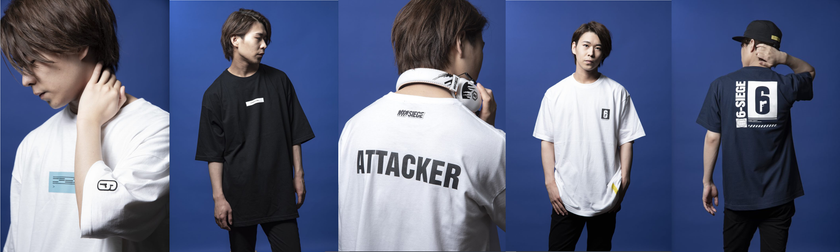 「レインボーシックス シージ」のロゴを生かしたシンプルなタイポグラフィーをデザインに落とし込んだアイコニックなベーシックモデルです。フロントはプレイ中の攻守のオペレーターをイメージしたロゴを配置し、バックは6のロゴをメインに世界各国のオペレーターがゲームの世界でつながっている様をイメージしたデザインになっています。