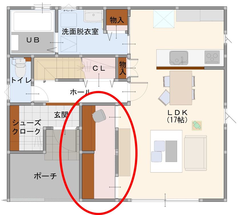 リビングやキッチンにいる親が、プレ1人部屋にいる子どもの様子を見守れる動線。子どもからのヘルプがすぐに伝わるとともに、親側も「今声をかけるべきか、どうか」という判断がしやすくなります。