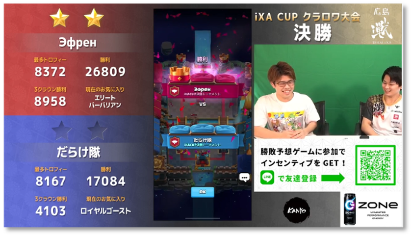 広島 TEAM iXAが主催するコミュニティ大会です。初開催から1年以上、定期的に開催され続けており、先日第12回が開催されました。今まで、ストリートファイターVや、クラッシュ・ロワイヤル、Rocket Leagueなどで実施されました。視聴者も観戦するだけではなく、最近は勝敗を予想するゲームに参加できるという特徴もあり、のべ視聴者は1万人を超えます。