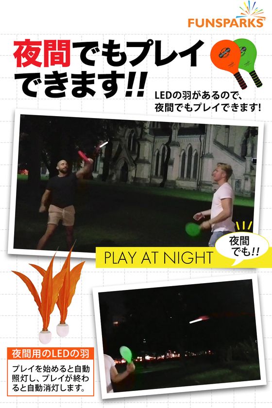 ジャズミントンのセットに付属したLEDの羽は、プレイを始めると自動照灯し、夜間や暗い室内でもプレイできます。
