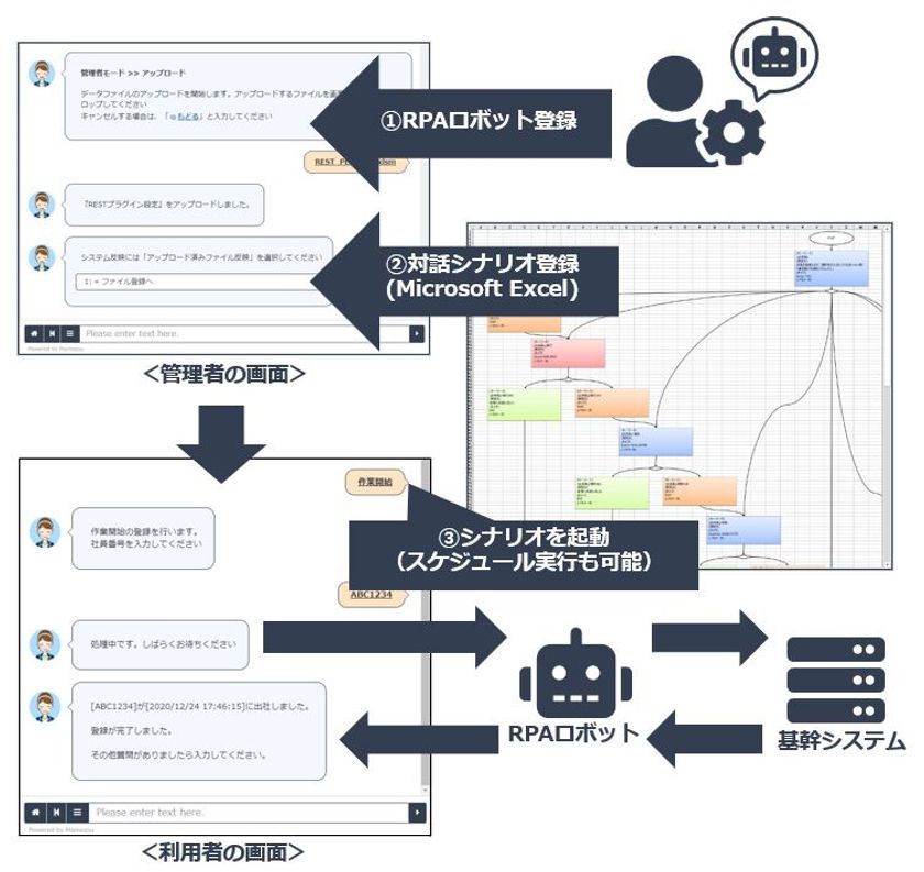 ユーザ企業の管理者が「Microsoft Excel」を使用してREST-API定義情報と対話シナリオをMZbotに登録することで、利用者はチャット画面を通じて、対話的に他システムからの処理結果を出力することが出来ます(図2)。対話シナリオはスケジュール実行機能により、スケジューラによる定時刻にバッチ処理も可能です。