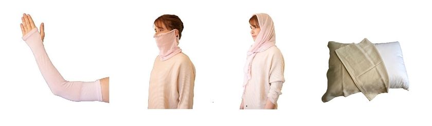 4商品画像(アームパック潤い、フェイスマスク潤い、ストール de 潤い、枕カバー)