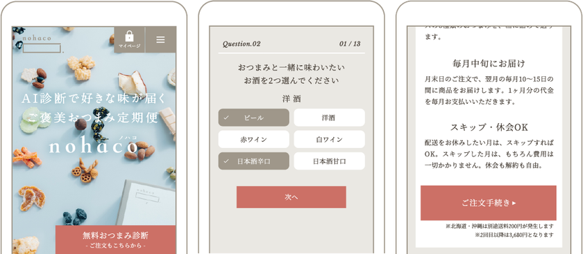 「nohaco」は、好みに合った6種のおつまみが毎月届く、おつまみ専門のサブスクリプションサービス。購入者の食や酒の好みの傾向を把握・分析し、個性あふれるおつまみの中から最適な6種をセレクトして、月1回定期便でお届けするシステムです。