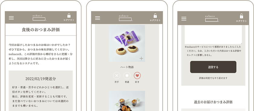 毎回ランダムに届けるのではなく、回数を重ねるごとに好みにフィットし、いわば“常連さん”になっていくシステム。食べたおつまみについての印象を「おつまみ評価」を入力・更新すると、分析精度がどんどん上がっていきます。