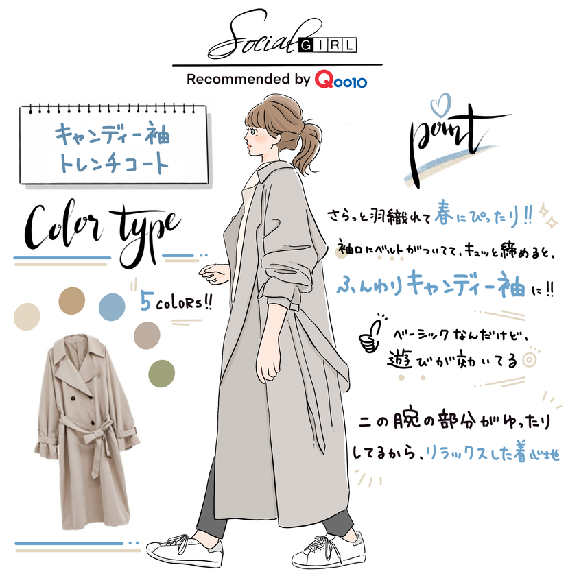 人気のコーナー、Qoo10 コーデ『今日のりおポチ』では、内田理央さんのこの時期のおススメファッションアイテムとしてSocial GIRL(ソーシャルガール)のキャンディー袖トレンチコートが紹介されました。