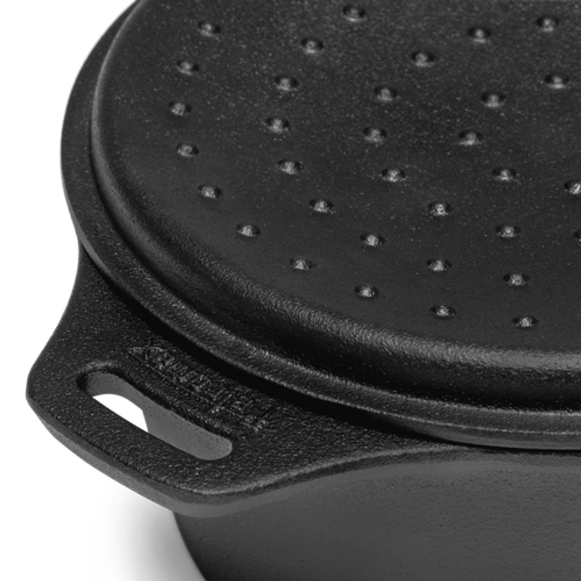 「小型ダッチオーブン」は、鍋の内径が約14cm、高さ8.6cm程度で持ち手を除く本体がすべて鋳鉄製ながら重さが2kgに満たない小鍋なので、ソロキャンプやご家庭で使うにもぴったりのサイズ感です。煮込み料理やスープ作り、そしてお菓子作りにも活躍します。ダッチオーブンは豊富な8サイズ展開。IH対応なので、ご自宅でもお使いいただけます。
