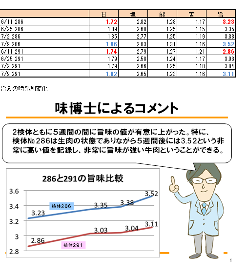 1.AISSY開発の味覚センサーにより、2つの検体(#291、#286ともにA3ランク)を屠畜後5週間、週単位で「うまみ」(その他4味覚、甘味、塩味、酸味、苦味、を含む)を評価した。その結果、2つの検体の「うまみ」は2週目より上昇し始め4週目以降さらに増加した結果が確認された。