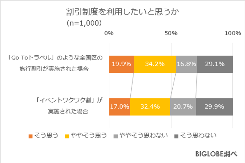 「Go To トラベルキャンペーン」のような全国区の旅行割引が実施されたら利用したいかという質問に対して、「そう思う(19.9%)」「ややそう思う(34.2%)」と合わせて54.1%が利用したいと回答した。また「イベントワクワク割」が実施されたら利用したいかという質問に対しては「そう思う(17.0%)」「ややそう思う(32.4%)」と合わせて49.4%が利用したいと回答した。どちらも半数近くが割引制度を利用して安く旅行やイベントを楽しみたいと考えているという結果となった。