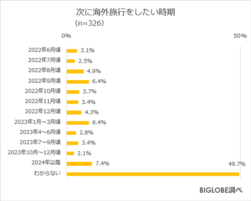 全国の20代から50代の男女1,000人のうち、「海外旅行をしたい/ややしたい」と回答した326人に「次に海外旅行をしたい時期」を質問したところ、「わからない」49.7%が最多となった。海外旅行をしたいものの、半数近くの人が具体的な予定は決めていないという結果となった。