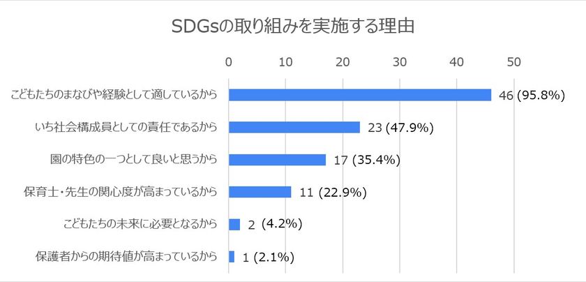 また、すでに園で取り組まれている理由として最も多かったのは「こども達の学びや経験のため」95.8%と、ほとんどの園さまがご回答されました。(複数回答)「一社会構成員としての責任」を挙げられた方も47.9%いらっしゃいましたが、やはりこどものためになること、は共通して持っていらっしゃる想いであることが伺えます。