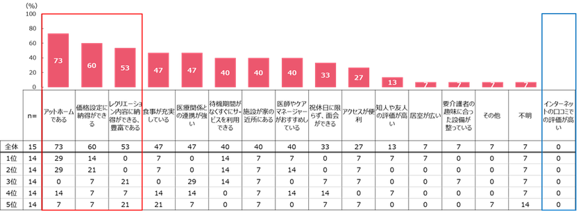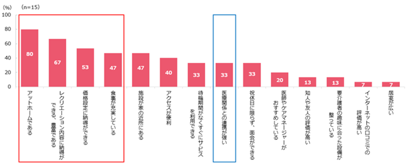 また、現状の介護サービスの評価理由の上位4項目である、「アットホームである」「レクリエーション内容に納得ができる、豊富である」「価格設定に納得ができる」「食事が充実している」は、介護施設を選択する際に重視している項目のトップ5に入っています。一方介護施設を選択する際に重視度が高かった「医療関係との連携の強さ」については今後強化していく余地があります。