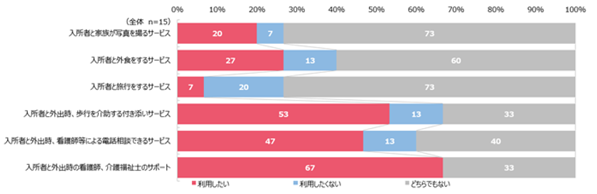 一般的な質問項目では、提供サービスに対して高望みはしていませんでしたが、「外出をサポートするサービスがあった場合に利用したいですか」という質問をすると、入所者との外出時には「歩行を介助する付き添いサービス」や「看護師、介護福祉士のサポート」、「看護師等による電話相談できるサービス」を半数が利用したいと回答しており、日常的に安心して、家族の負担が少なく外出を可能にするサポートサービスのニーズが高いというのがおぼろげにみえてきました。