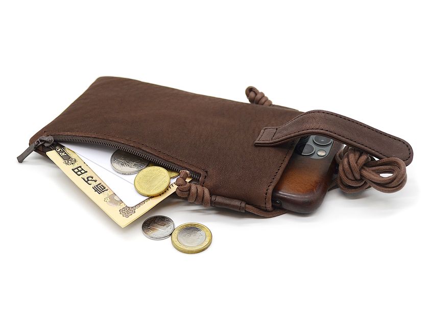 第一弾注目のアイテムは、高級イタリアンレザーの余り革×スマホポーチです。
