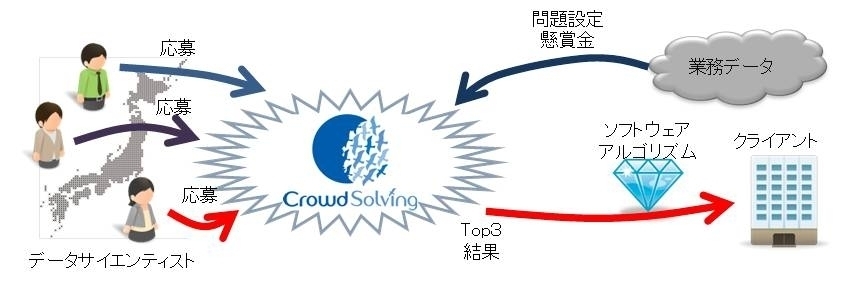 分析したいデータを保有する企業等が、「分析目的」「期間」「分析したいデータ(個人情報は含まない)」を、データ解析クラウドソーシングサイト「CrowdSolving(TM)」を通じてデータ分析を依頼し、会員登録している多数のデータサイエンティストがサイト上で分析精度を競い合うことで、より高精度な分析/予測モデル、評価レポートを提供した上位者へ懸賞金が支払われる、日本初の「データ解析クラウドソーシング・マッチングサイト」です。