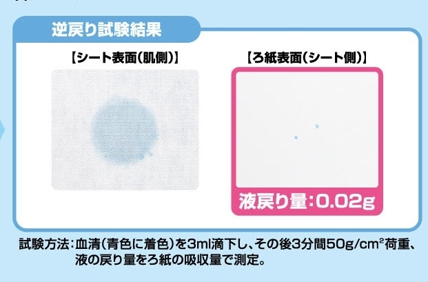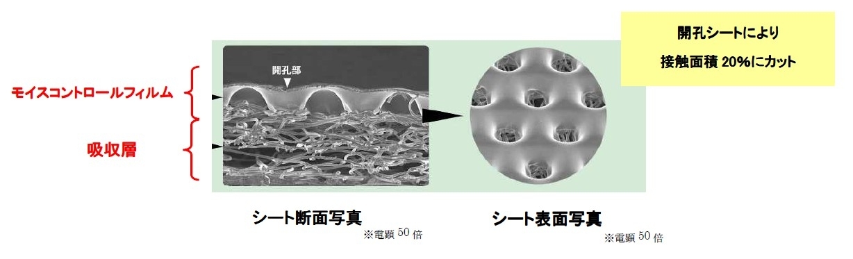 「モイスコントロールフィルム」のシート表面に占めた開孔部により、接触面積を20%にすることで創傷部への貼り付きを抑え、肌にやさしいシートになっています。