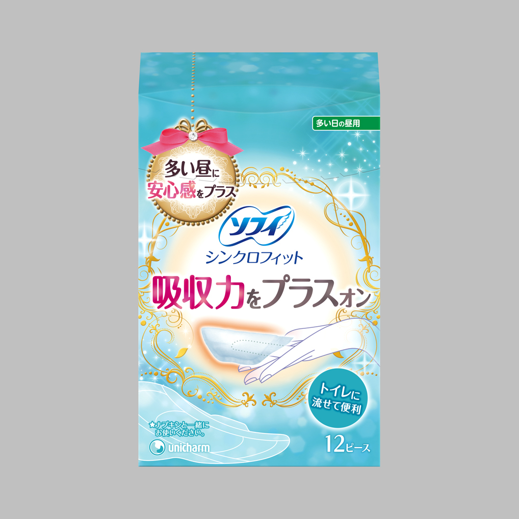 近年、女性の社会進出や有職者の増加に伴い、活動的に過ごす女性が増えています。そのような女性は、生理期間においても「できるだけ快適に過ごしたい」「生理であることを周囲に気づかれず、いつも通り過ごしたい」という思いから、スリムナプキンを使用する傾向にあります。しかしながら、経血量が多い日や長時間トイレに行けない時は、スリムナプキンではモレに対し不安を感じている女性が多くいらっしゃいます。『ソフィ シンクロフィット』はナプキンにプラスオンして使用することで、多い昼でも安心して活動的に過ごすことができる新習慣ナプキンです。スリムナプキンの快適さをそのままに、安心感だけプラスできるので、特にスリムナプキン使用者からご好評頂いています。また使用後はトイレに流せるので、手を汚さずに後処理も簡単です。そこでこの度、多くの方に『ソフィ シンクロフィット』をお使い頂く為に、パッケージを刷新し2013年4月下旬より全国にて発売いたします。