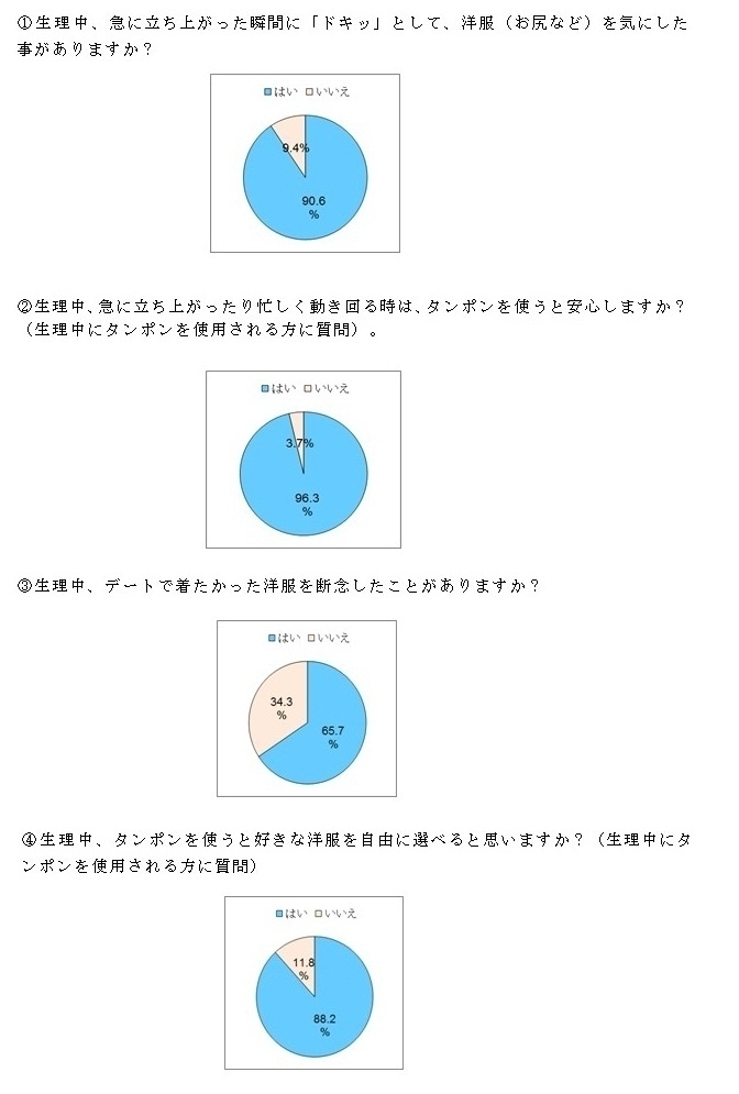 「生理中、急に立ち上がった瞬間に“ドキッ”として洋服やお尻などを気にしたことがある」と、全体の90.6%が回答したのに対し、タンポン使用者の96.3%が「急に立ち上がったり忙しく動き回る時は、タンポンを使うと安心」と回答しました。
