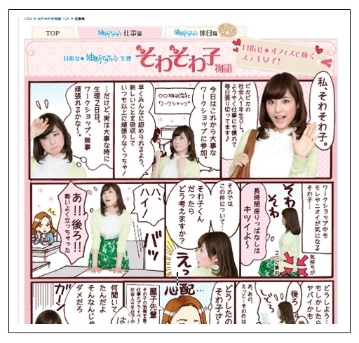 また当社では、生理期間を快適に過ごして頂く情報提供として、ルナルナ会員様とソフィサイトにて、生理中の悩みに対する対処法を、わかりやすいイラスト風にした“そわそわ子物語”を配信しています。第1弾は「お仕事編」として、長時間トイレに行けずにふと伸びをした際に、経血が“ドバッ”と出た感じを実感した社会人1年目のOL「そわそわ子」が、憧れの先輩から対処法について学習するという内容になります。