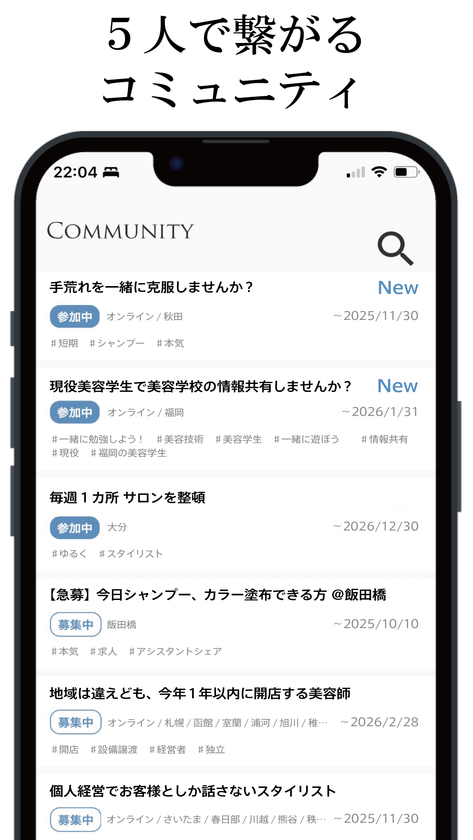 ・「余ったカラー材を共有しませんか?@表参道」「単発でアシスタントに入れます!」「カット100人頑張る会」などの各カテゴリに、5人までのメンバーが参加し、チャットが可能。