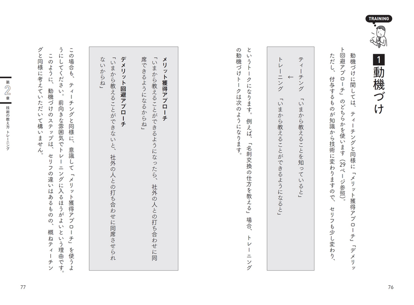 加えて、本書では、「型(セオリー)」を学んだのち、「教えるタイプ」と「教わるタイプ」の相性や、タイプ別の指導法なども紹介。指導方法に迷った際も、振り返ることができる仕様となっています。